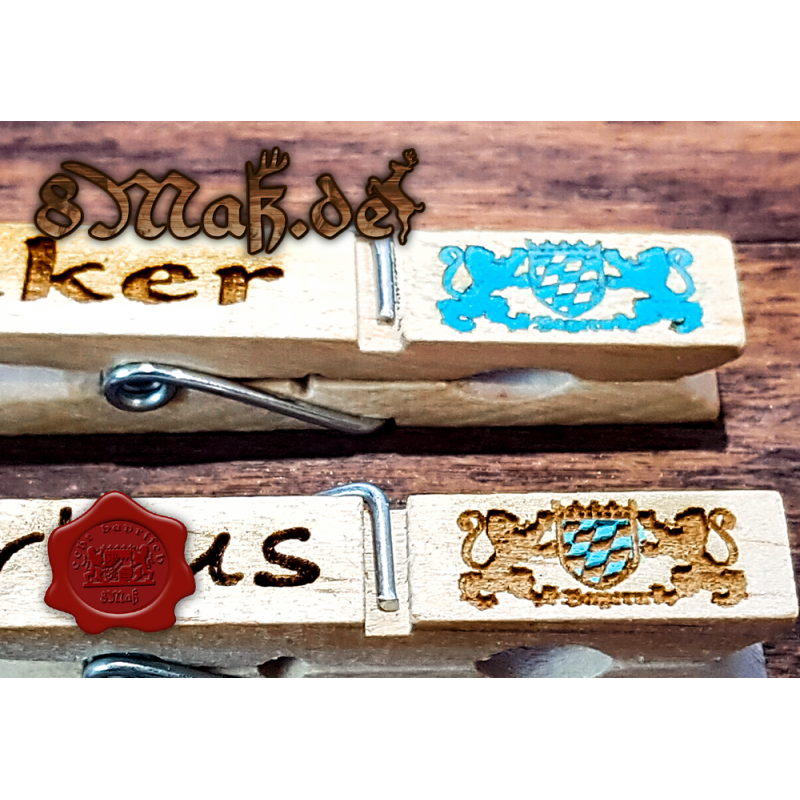 Glubbal mit altem bayrischen Wappen. Entweder in Holz graviert natur, oder die Gravur blau ausgelegt.